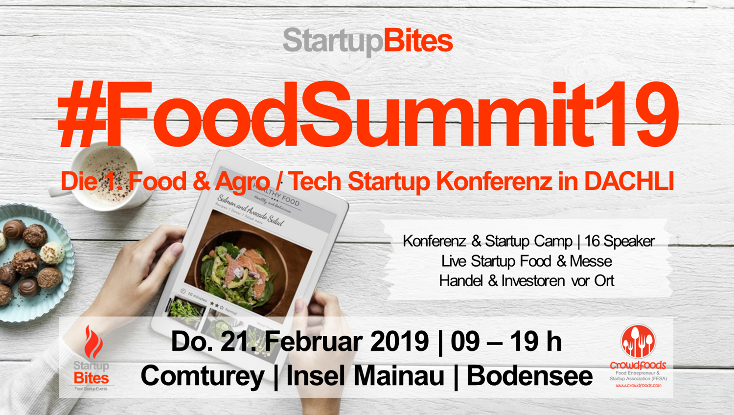 Nach der Gründung als erster Verband für Food & Agro Startups in Deutschland, Österreich, der Schweiz und Liechtenstein veranstaltet die Food Entrepreneur & Startup Association crowdfoods.com am 21. Februar 2019 mit dem „StartupBites #FoodSummit19“ auf der Mainau die erste länderübergreifende Konferenz für Food- und Agro-Startups am Bodensee.